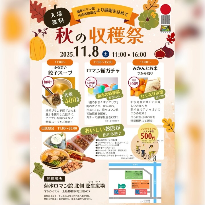 10222025菊水ロマン館秋の収穫祭(11月8日開催)イベント Post Share Hatena LINE RSS feedly Pin it note この記事のタイトルとURLをコピーする熊本県玉名郡和水町にある「道の駅きくすい 菊水ロマン館」では、秋の感謝祭を11月8日土曜日に開催します!火の本豚を使用した餃子など美味しい秋の味覚をたくさん味わってみてください! Post Share Hatena LINE RSS feedly Pin it note この記事のタイトルとURLをコピーする 和水町初の『ピクニックシネマ』(11月8日開催)前の記事