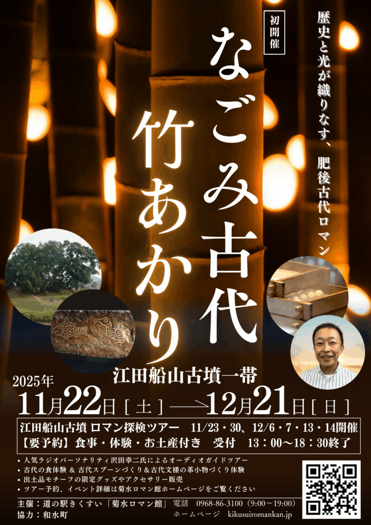 菊水インターから車3分。熊本県和水町の国指定史跡・江田船山古墳公園一帯を舞台に、地元竹の灯りが森を包む夜の体験イベント『なごみ古代、竹あかり』(入場無料)を2025年11月22日(土)〜12月21日(日)に開催します。期間中は、古代衣装で光る剣を手に歩く参加型「江田船山古墳 ロマン探検ツアー」も実施。古墳好きとして知られる沢田幸二さんの音声ナビゲートで、“光と物語の冒険”へ。古代アクセサリーを題材にしたクラフト体験や、古代米おにぎり&豚汁の食体験「王の食卓」も楽しめます。